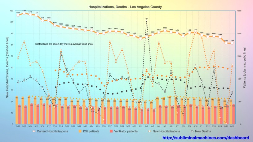 Today, Los Angeles County was back to its recent typical new confirmed case count with 1293 more new confirmed cases than the total announced yesterday. New hospitalizations was also back up to a more usual level of sixty-three. New deaths also increased from nineteen to thirty-three.