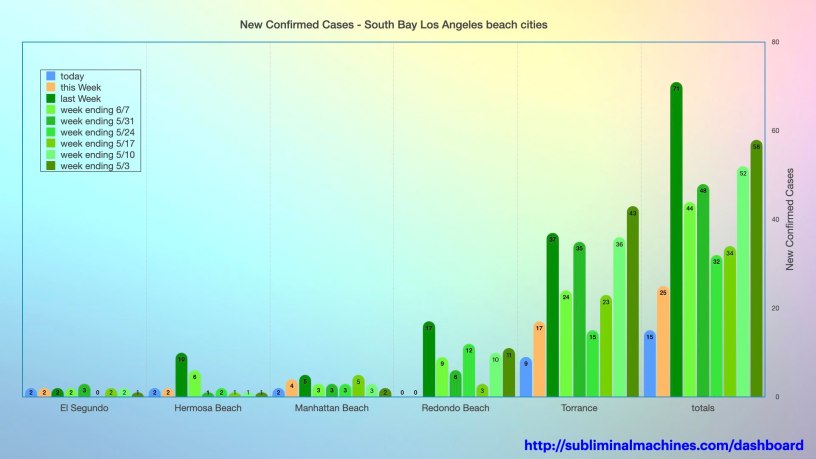 As we hit mid-week today, the new confirmed cases rise. Torrance was in the lead as usual with a further nine more new confirmed cases. El Segundo, Hermosa Beach and Manhattan Beach each added two to their totals. Technically, Redondo Beach added one new confirmed case but there was a correction that removed two from their count yesterday so we’ll leave that single off the scoreboard.