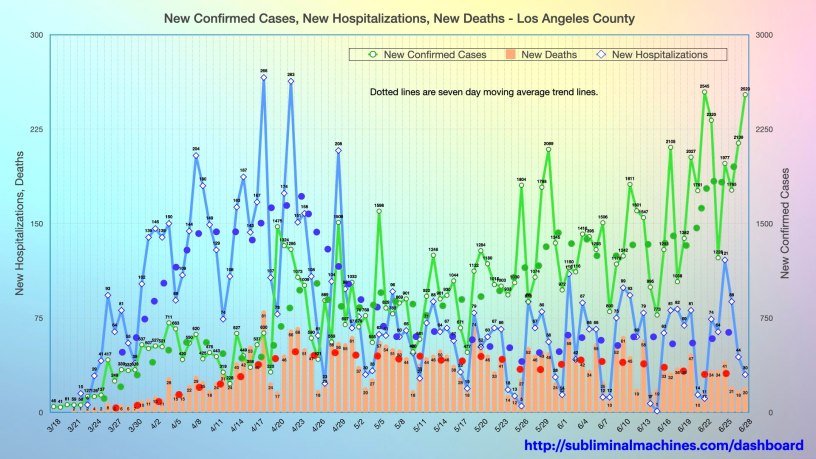 Today, Los Angeles County had 2,523 more new confirmed cases than the total from yesterday. This is the second highest single day increase. Monday started the week with the highest single day increase. In between the week’s bookends, the county also had the third, fourth, eighth and twelth highest one day increases. As the county Director of Public Health stated on Monday, “What we really saw today, and I think what we’ve been seeing all along is what I would call a real increase that is attributed to more community transmission.”