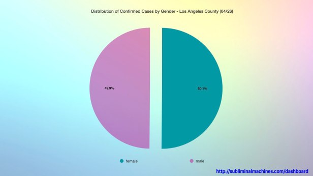 Chart showing the distribution of Confirmed Cases by gender for Los Angeles County. There were a nominal number (5) attributed as Other and 192 cases that are under investigation.