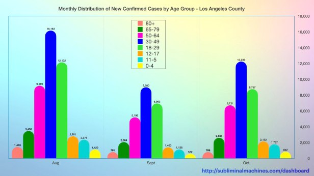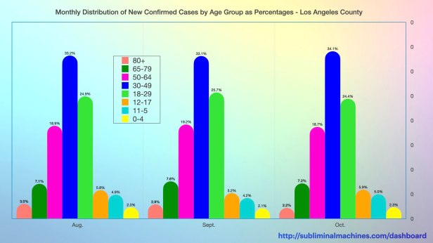 New! Chart of monthly distribution of New Confirmed Cases by Age Group as Percentages for Los Angeles County as a whole over the past three months.