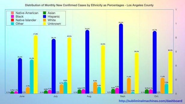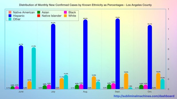New! Chart of monthly distribution of New Confirmed Cases by Ethnicity as Percentages for Los Angeles County as a whole.