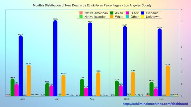 New! Chart of monthly distribution of New Deaths by Ethnicity as Percentages for Los Angeles County as a whole.