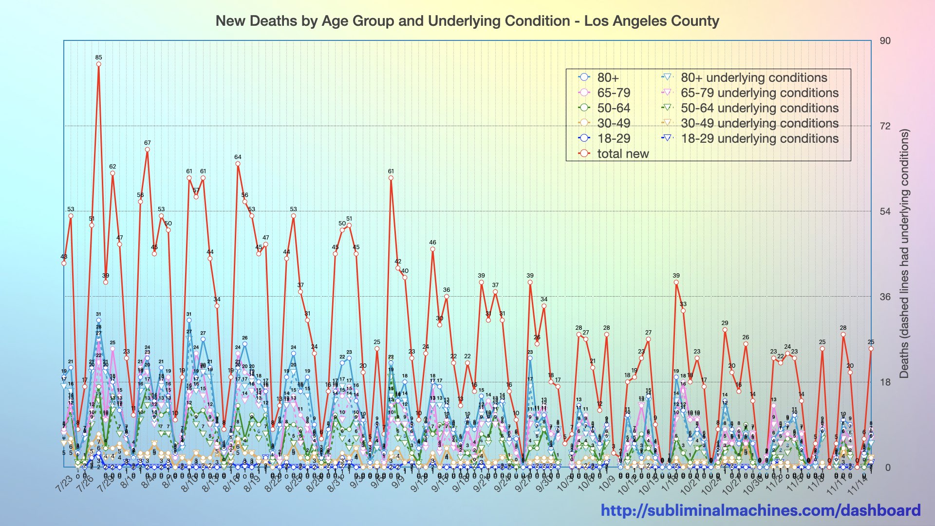 New! Chart of distribution of New Deaths by Age Group (solid green, blue, orange, magenta lines) and Underlying Conditions (dashed lines) for Los Angeles County. The solid red line is total New Deaths.