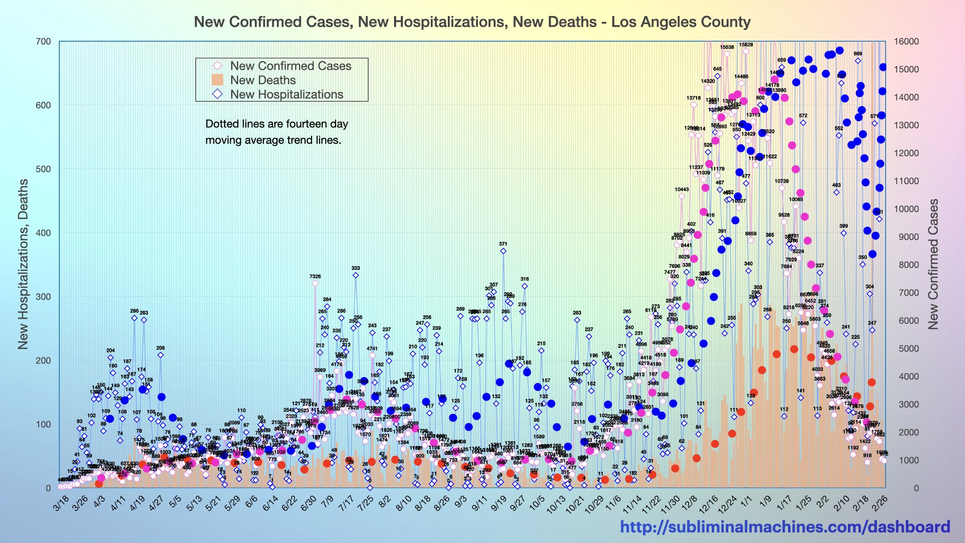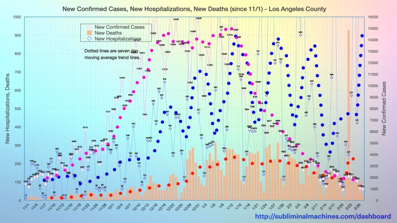 This chart provides an instantaneous snapshot of the current situation in Los Angeles County. While the day to day jumps track the jagged dynamic motions, it is the colour dotted lines of seven day moving average trend lines that tells the story of what is going on.