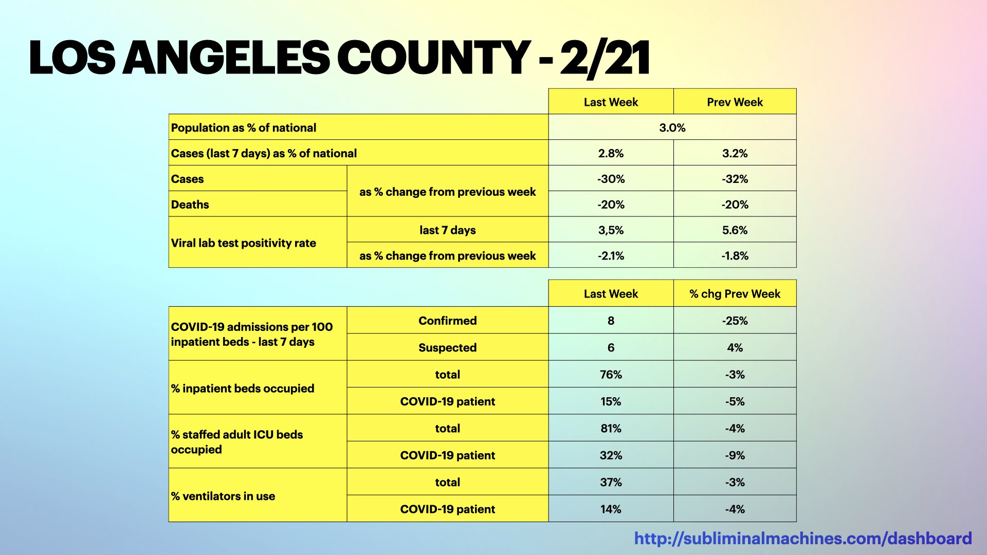 With only 3.0% of the country’s population, Los Angeles County has 4.3% of the country’s cases over the past seven days, making us the top ranked county in the entire country according to the White House COVID-19 Task Force. The county’s share of the national cases has decreased from 6.3% last month.