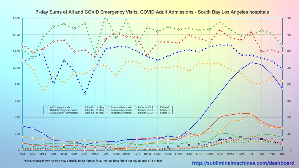 New! Chart showing the timeline of 7-day sums of All Emergency Department Visits (dotted lines), COVID-19 Emergency Department Visits (solid lines) and COVID-19 Adult Admissions (dashed lines) at the local South Bay Los Angeles Hospitals.