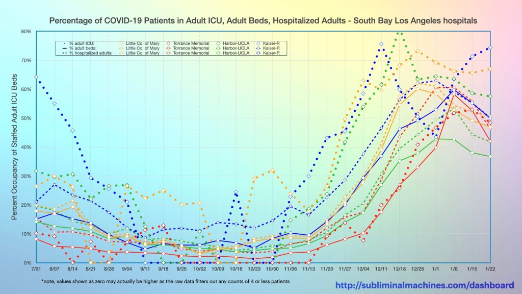 New! Chart showing the timeline of the percentages of total confirmed and suspected (adult) patients in the Adult ICU (dotted lines), in Adult beds (solid lines) and among all Adult Patients (dashed lines) at each of the local South Bay Los Angeles Hospitals.