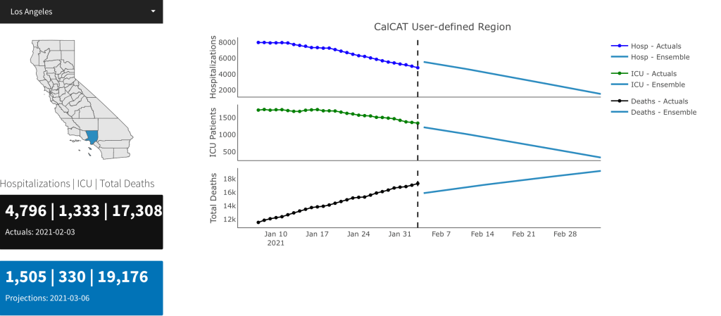 The chart below shows the cumulative count of COVID-19 deaths in Los Angeles County hospitals along with estimated and forecast models.
