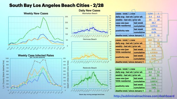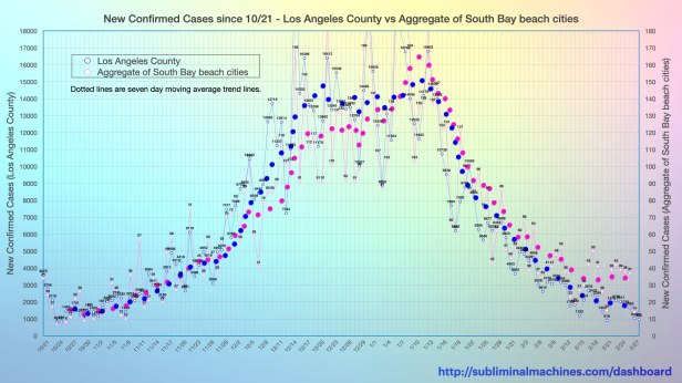 The number of daily new confirmed cases in both Los Angeles County and the local South Bay beach cities increased alarmingly through November and much of December. Daily case counts in both regions then plateaued at triple the peak of the summer surge. Daily new confirmed cases have decreased substantially since mid-January.