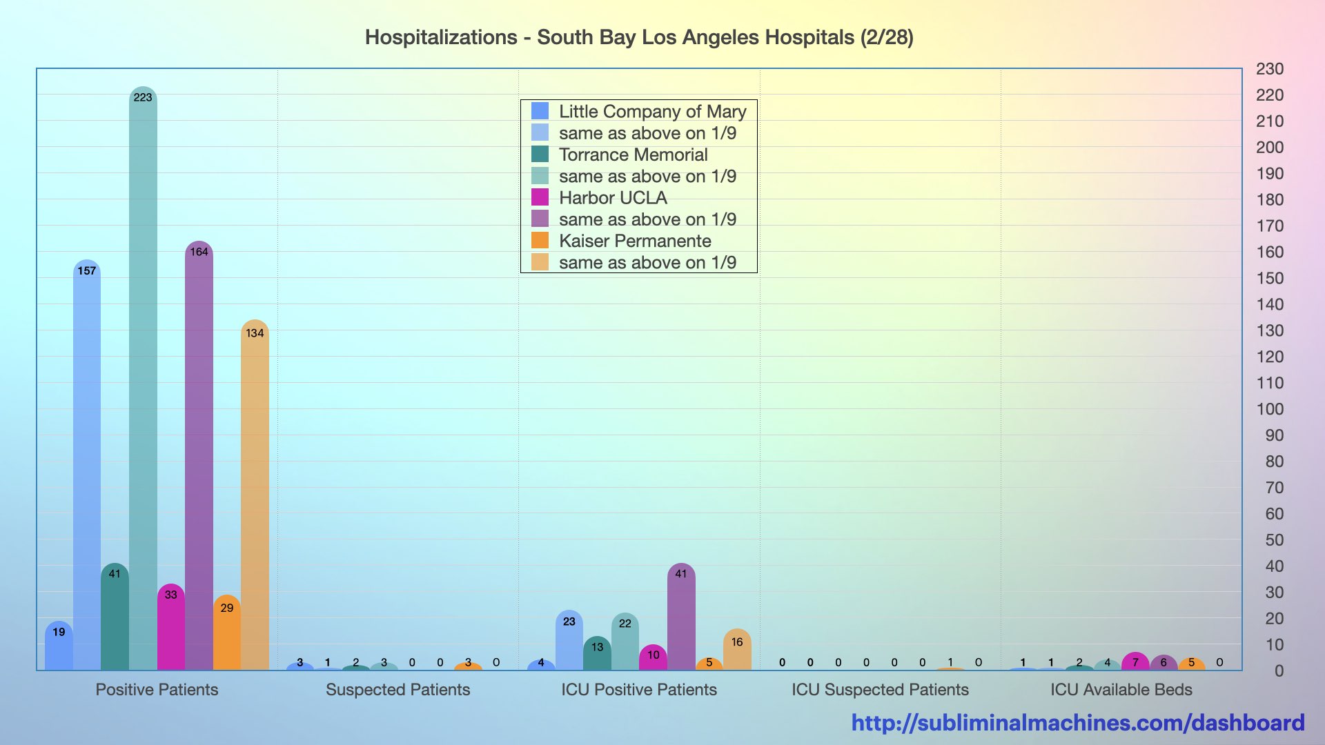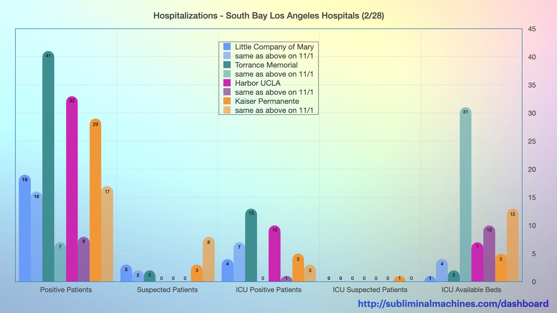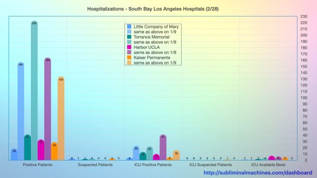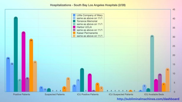 Chart showing the counts of Positive Patients, Suspected Patients, ICU Patients (both positive and suspected) and ICU Available Beds at the local South Bay Los Angeles Hospitals.