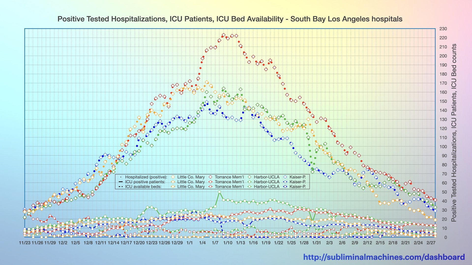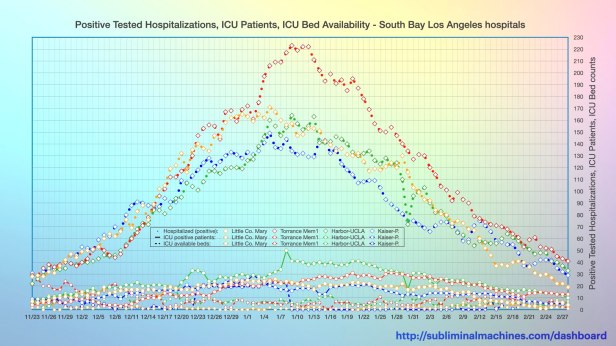 New! Chart showing the timeline of daily counts of Positive Patients (dotted lines), Positive ICU Patients (solid lines) and ICU Available Beds (dashed lines) at the local South Bay Los Angeles Hospitals.