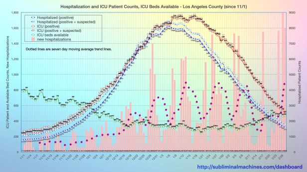 The magenta dotted line in the chart below shows the seven day average of daily new confirmed cases in Los Angeles County. This appears to have reached a peak on December 21st and then plateaued for three weeks before decreasing mid-January. The blue dotted line in the chart below shows the seven day average of daily new hospitalizations. This appears to have sharply increased to a hump peaking December 21st, followed by an even higher hump that peaked on January 2nd and a third hump now peaked as well and decreasing. The seven day average of daily deaths increased gradually across most of the month of December, picked up the pace tracking the current humps of increases in hospitalizations and has now levelled off.