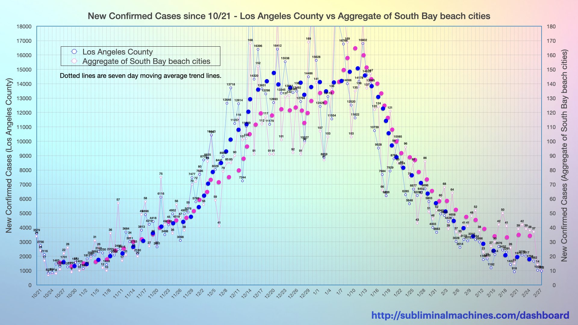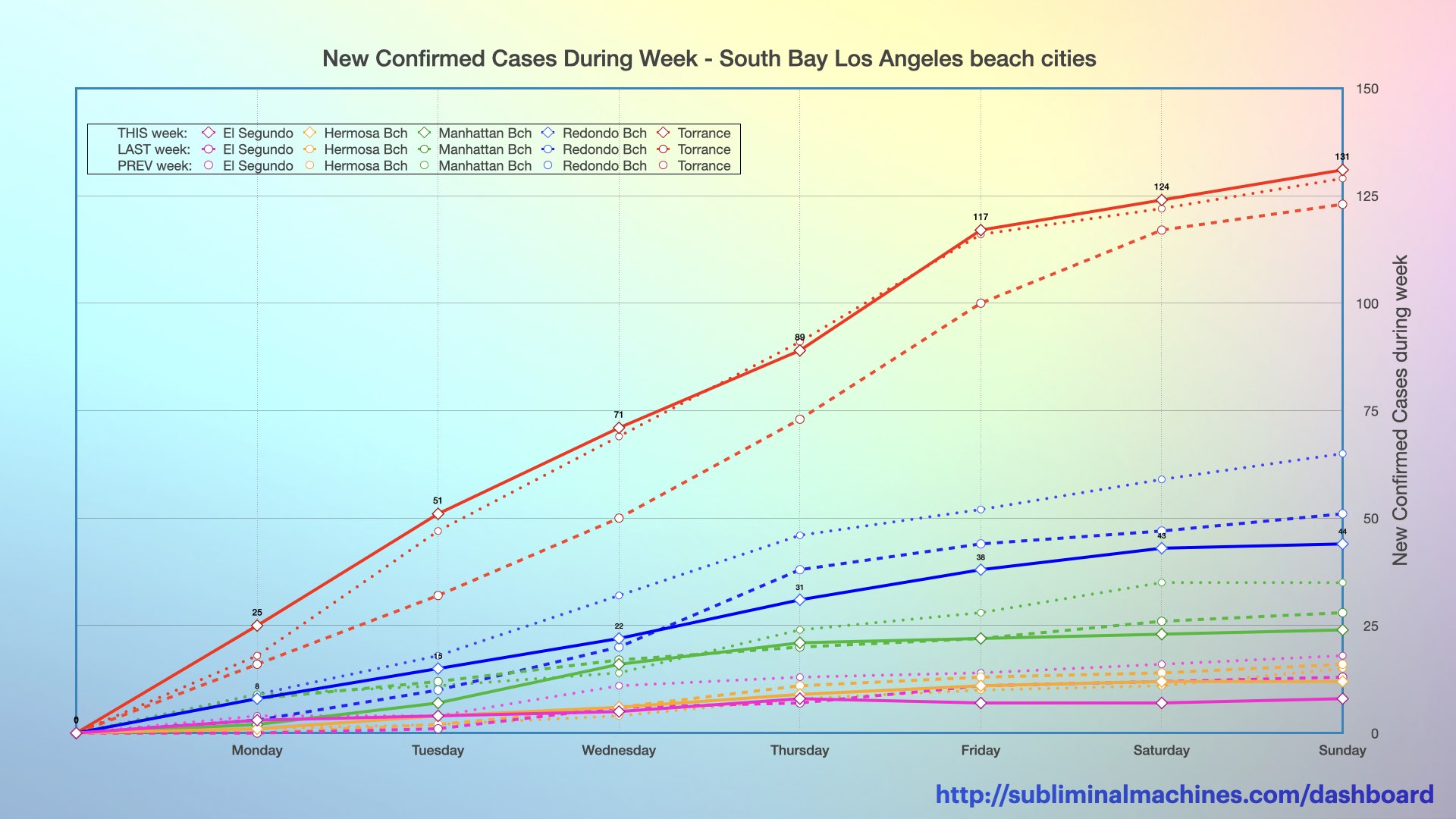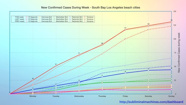 New! Chart showing the increase in confirmed cases over the course of the current week (solid lines), the last week (dashed lines) and the week before that (dotted lines) for each of the local beach cities.