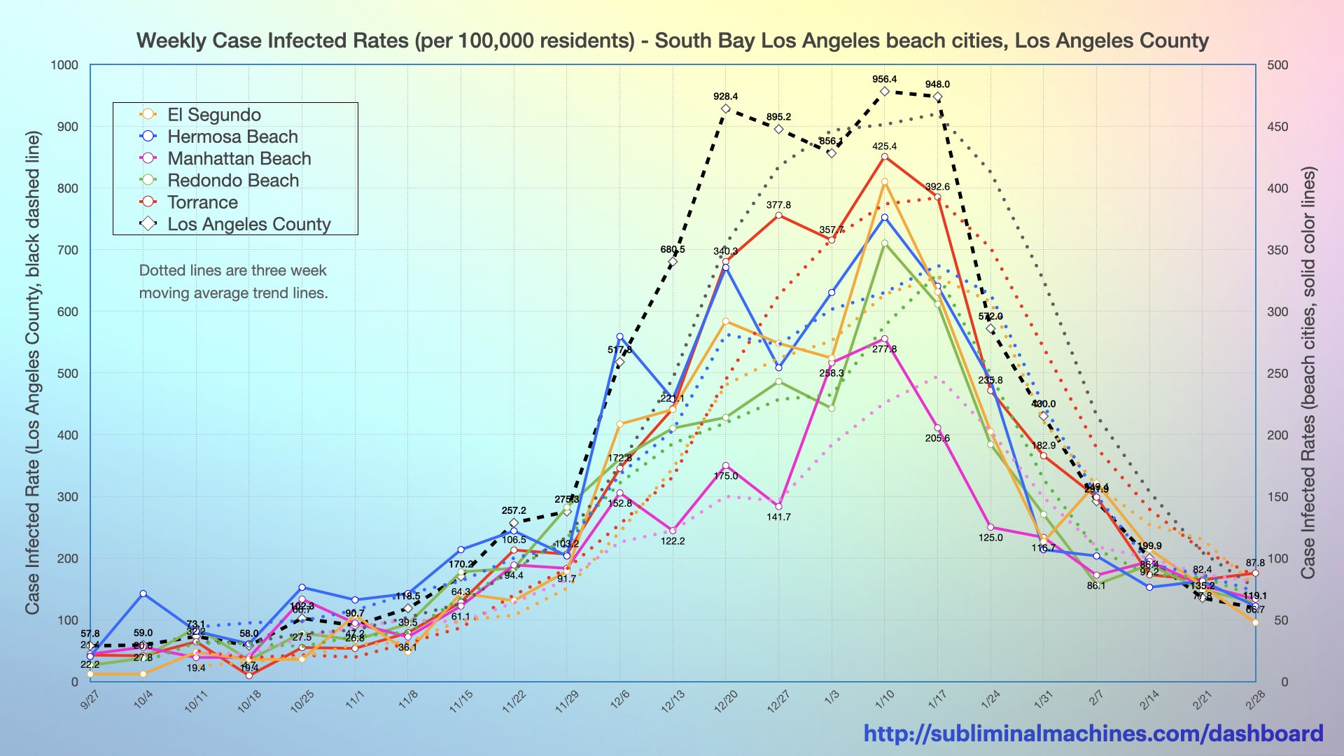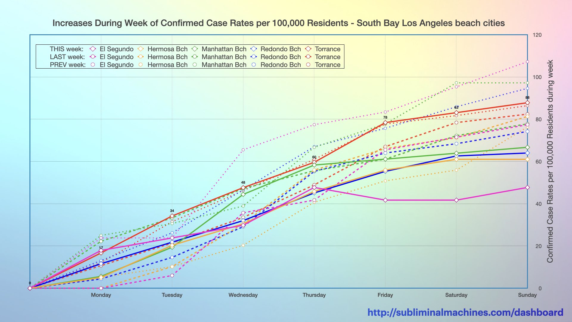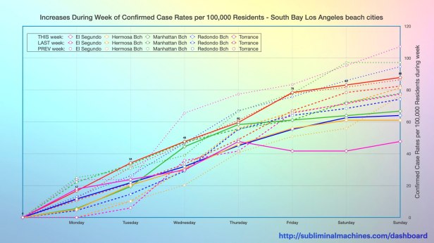 New! Chart showing the increases in the confirmed case rates per 100,000 residents over the course of the current week (solid lines), the last week (dashed lines) and the week before that (dotted lines) for each of the local beach cities.
