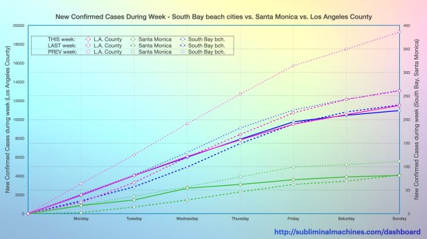 New! Chart showing the increase in confirmed cases over the course of this week (solid lines), the last week (dashed lines) and the prior week before that (dotted lines) for Los Angeles County, the local beach cities considered as an aggregate and Santa Monica (selected for comparison).