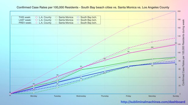 New! Chart showing the increases in the confirmed case rates per 100,000 residents of the South Bay beach cities, Los Angeles County as a whole and Santa Monica (selected for comparison) over the course of the current week (solid lines), the last week (dashed lines) and the week before that (dotted lines).