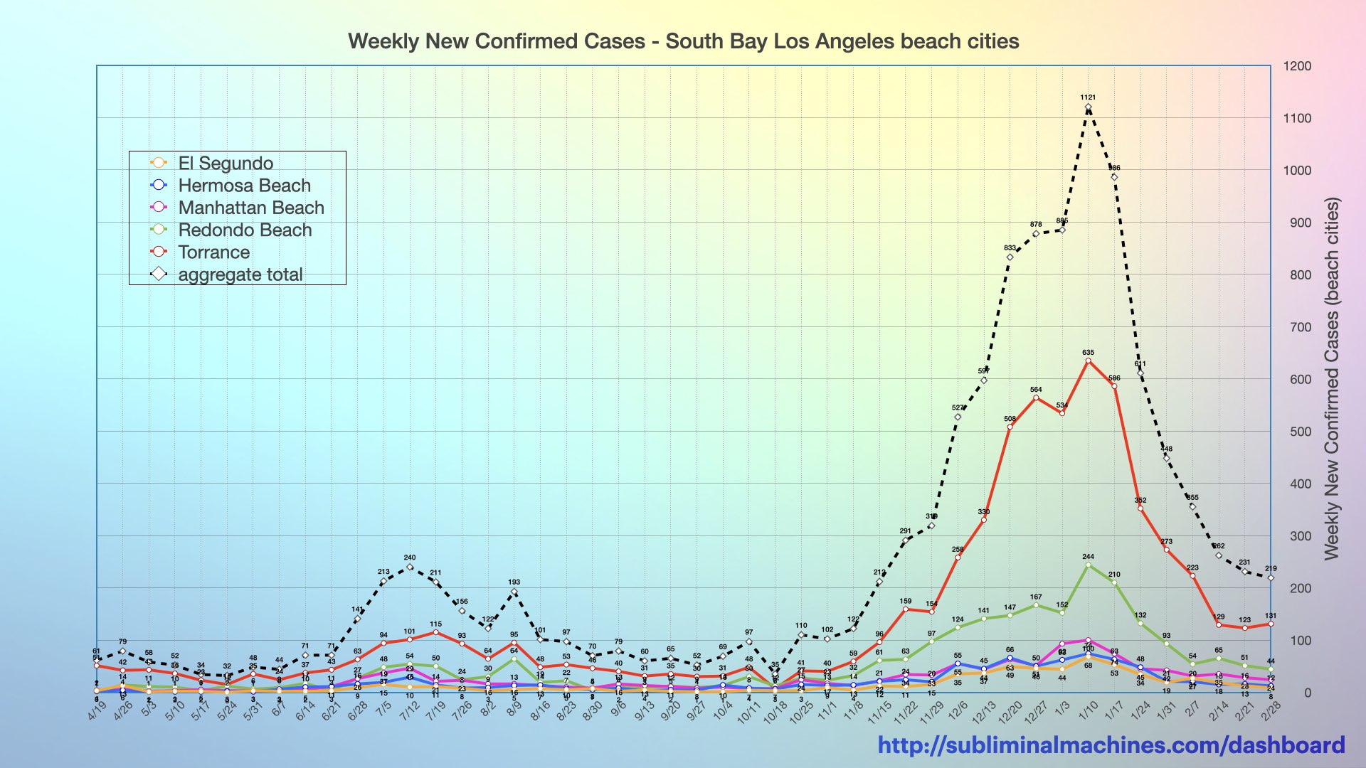 Chart of weekly New Confirmed Cases for El Segundo, Hermosa Beach, Manhattan Beach, Redondo Beach and Torrance (solid coloured lines) as well as the combined total for these cities (dashed black line).