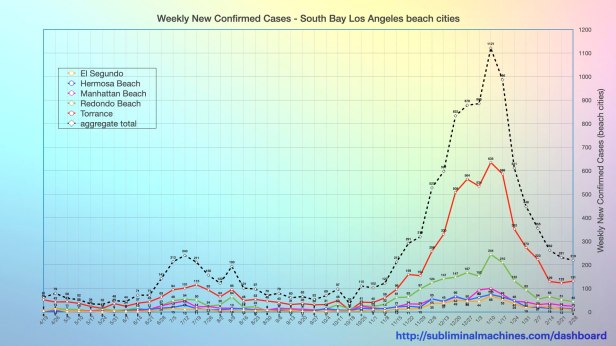 The chart below is a timeline showing the weekly number of new confirmed cases in each of the local South Bay beach cities from El Segundo to Torrance and as an aggregate total. The dramatic decreases in new confirmed cases in these cities in recent weeks has mostly levelled. The aggregate total of new confirmed cases in these beach cities is still at approximately the same level as the peak of the summer surge.