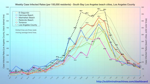 The chart below is a timeline showing the weekly number of new confirmed cases as a rate per 100,000 residents in each of the local South Bay beach cities from El Segundo to Torrance and Los Angeles County considered as a whole. The dotted lines show three week moving average trend lines. All of the areas charted below last week for the third consecutive week.